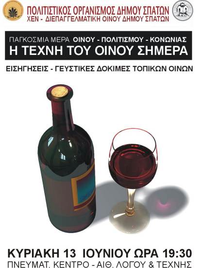 Την Κυριακή 13 Ιουνίου 2010 στην Αίθουσα Λόγου και Τέχνης του Πνευματικού Κέντρου η ΧΕΝ Σπατων και τη Διεπαγγελματικη Ενωση Οινου Δημου Σπατων την Παγκόσμια Ημέρα «Οίνου-Πολιτισμού-Κοινωνίας» διοργανόθηκε βραδιά με παρουσιάσεις και γευστικές δοκιμές οίνου, στην εκδήλωση με θέμα «Η ΤΕΧΝΗ ΤΟΥ ΟΙΝΟΥ ΣΗΜΕΡΑ» Ο οινοποιός Δ. Γεώργας ανέπτυξε το θέμα: "Ο χαρακτήρας του
